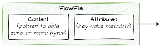 FlowFiles are units that carry data (content) and metadata (attributes):