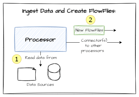Some processors have the capability to read in data from external sources (i.e., files, databases etc.) and using that data to create and send FlowFiles to other processors. Others have capabilities including updating FlowFiles, routing them and finally some specialise in sending data outside of NiFi using a variety of mediums and formats. Here are some common types of processor pattern: